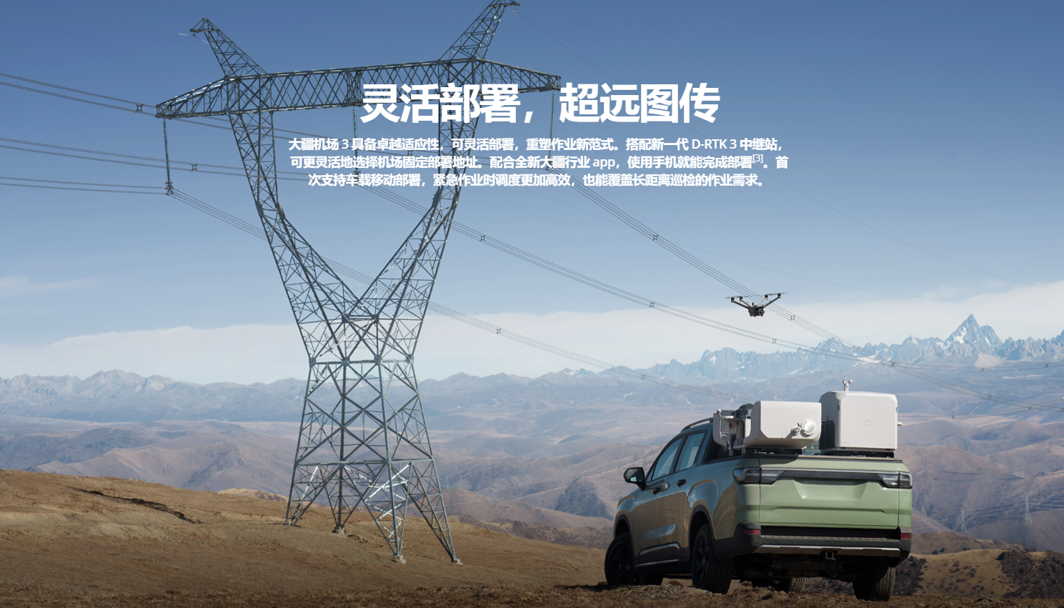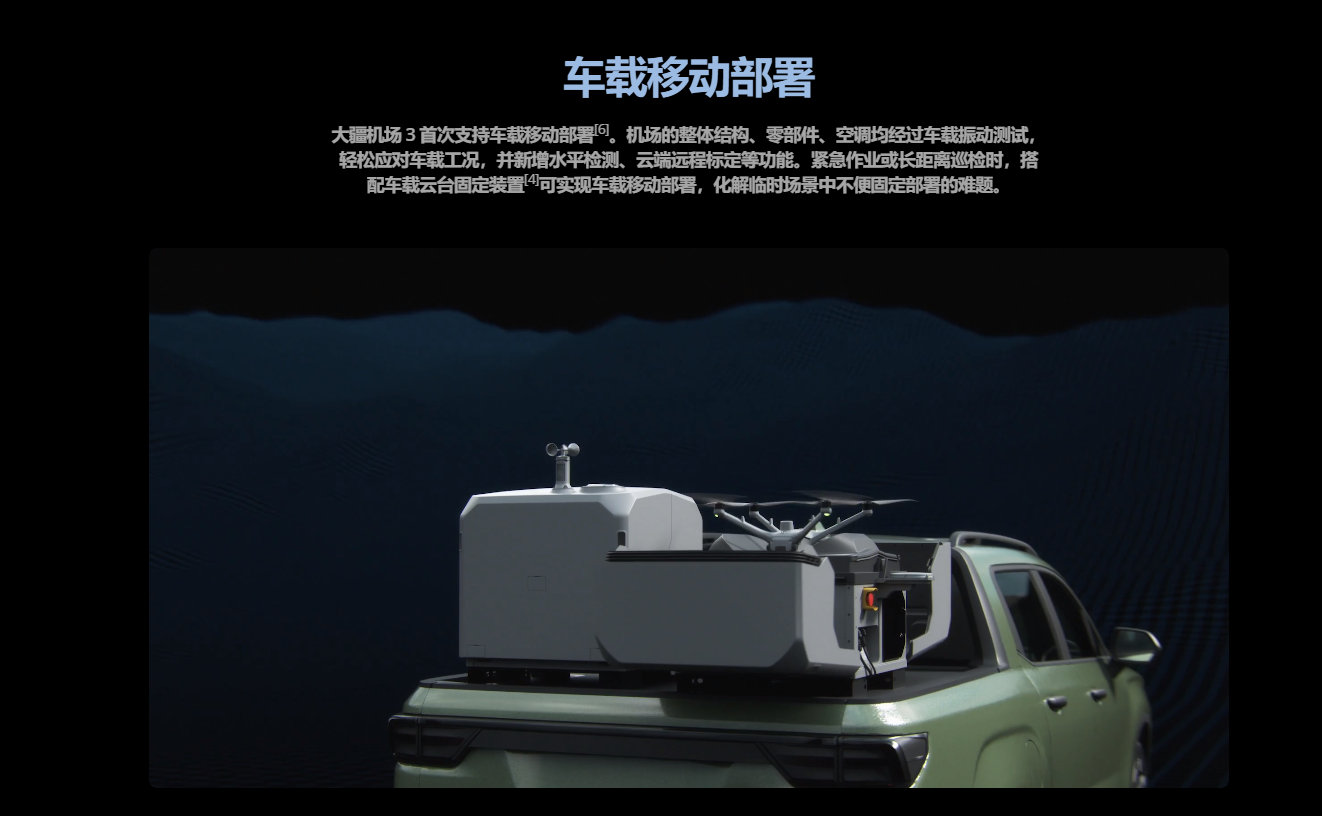 大疆机场 3 配备专有 Matrice 4D/Matrice 4TD 高性能无人机,赋能全天候、全场景无人值守作业,并首次支持车载移动部署,从容驾驭各种作业环境。无人机所搭载相机与 Matrice 4 系列一脉相承,且飞行及防护性能更佳,还可搭配 DJI RC Plus 2 行业版遥控器单独使用。通过大疆司空 2,结合全新智能功能,进一步节省作业时间和人力成本。